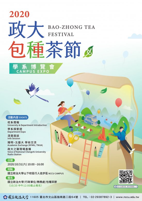 二、活動訂於 109 年 10 月 31 日(六)假本校山下校區行人徒步區舉行,內容包含校系簡介、學系博覽、學系深度座談會、學系特色展演、學術交流及現場轉播(政大之聲實習廣播電台)。