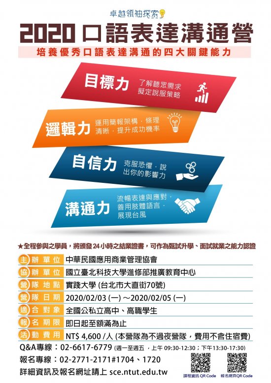 國立臺北科技大學推廣教育中心合辦「2020 年寒假冬令營-卓越領袖探索系列」招生資訊