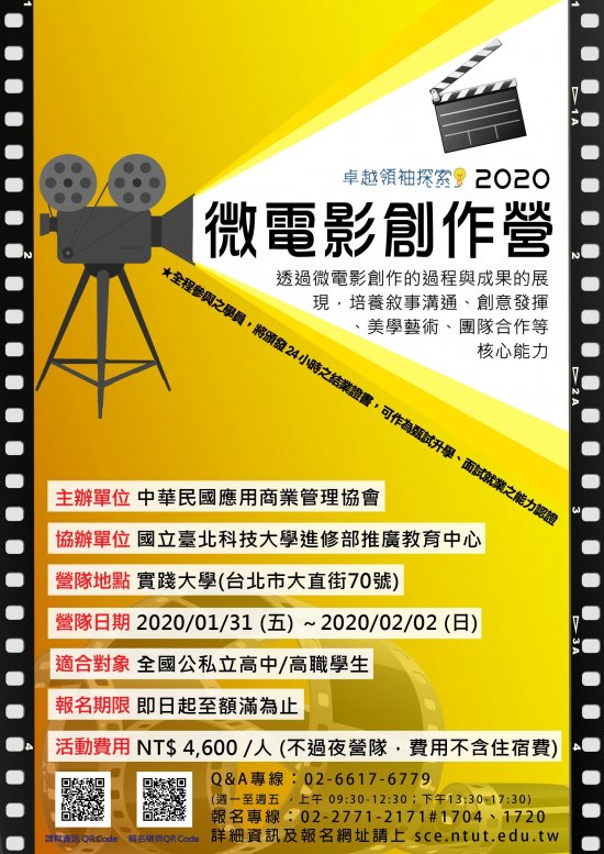 (一)微電影創作營: 2020 年 1 月 31 日-2 月 2 日。
