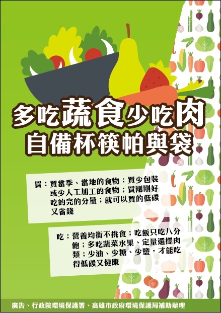 一、依據「高雄市環境維護管理自治條例」第七條規定及本市市議會 108 年度第 3 屆第 2 次定期大會衛環部門質詢事項辦理。 二、本局近年來積極結合各界團體及綠色友善餐廳來推廣蔬食減碳及低碳飲食,茲為加強推動低碳生活,以減少溫室氣體排放