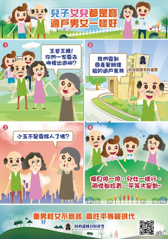 為宣導財產權性別平等意識,檢送「兒子女兒都是寶 過戶男女一樣好」宣導文宣