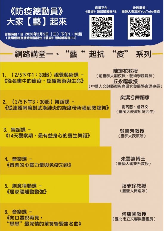 (一)「“藝”起抗“疫”」系列的六門課,係透過視覺藝術、舞蹈、音樂、律動等,讓民眾認識傳染病對文化藝術的影響、心靈力量與藝術養生之道。