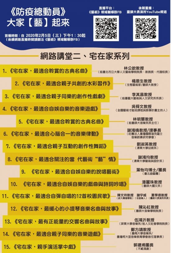 一、因應 2019 新型冠狀病毒疫情持續延燒,本校表演藝術研究所夏學理所長號召 26 位一流名師,自 2020 年 2 月 5 日起,共同攜手籌組 21 門網路課程,分別為「“藝”起抗 “疫”」與「宅在家」等兩系列課程。