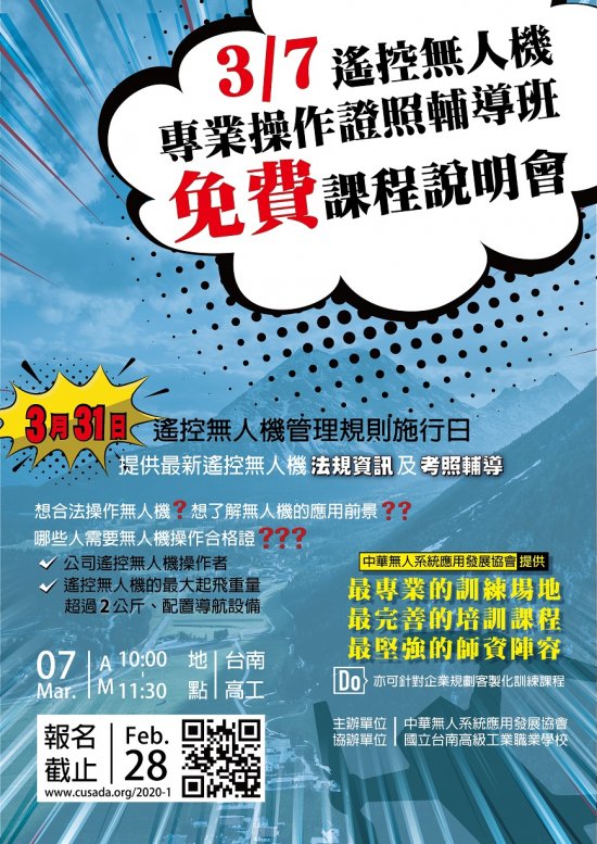 一、交通部民航局公告 2020 年 3 月 31 日起將實施「遙控無人機管理規則」。 二、因應新法規要求,本校與中華無人系統應用發展協會於 2020 年 3 月 7 日辦理無人機操作證輔導課程說明會,相關說明請參閱附件海報。