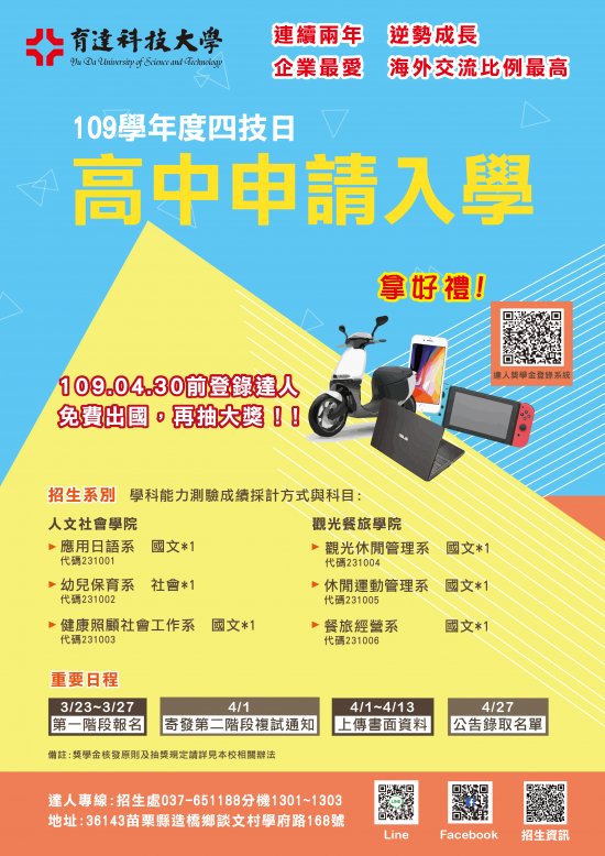 一、招生系別:應用日語系、幼兒保育系、觀光休閒管理系、健康照顧社會工作系、休閒運動管理系、餐旅經營系,詳情請見招生簡章。 二、報名日期: 109 年 3 月 23 日至 109 年 3 月 27 日。 三、招生相關資訊可於本校招生資訊網頁(https://reurl.cc/EKq10g)下載。 四、 109 年 4 月 30 日前完成本校 109 學年達人預約系統登錄、註冊就讀,可獲頒至少 1 萬元獎學金及電動機車等抽獎機會,詳情請見本校招生網站。
