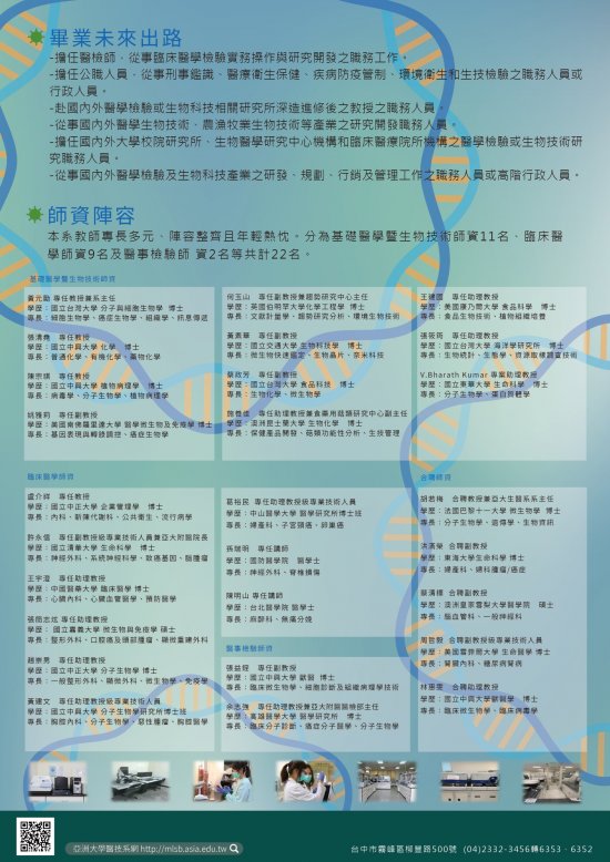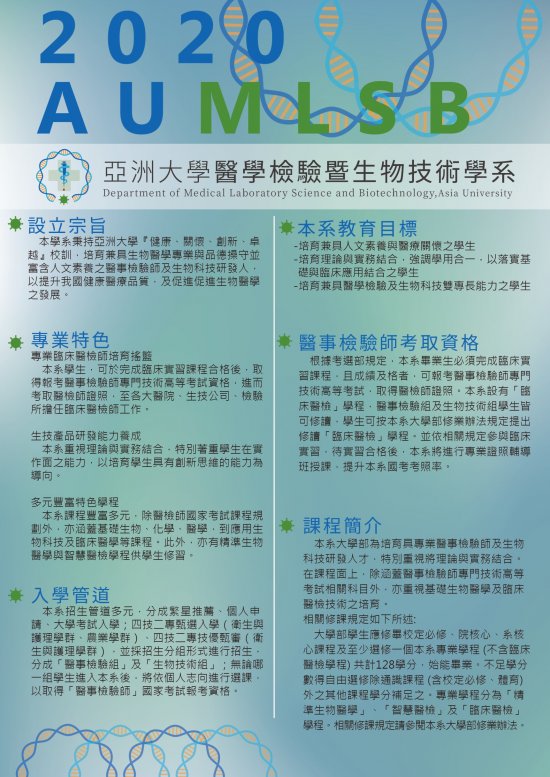 一、亞洲大學獲教育部同意於 109 學年度起正式招收醫學檢驗暨生物技術學系,附上本系系主任的信件與本系簡介,若貴校學生對醫技系有興趣的,還望輔導主任能代為宣導亞洲大學今年成立醫學檢驗暨生物技術學系。 二、若貴校高三學生在備審資料撰寫、面試技巧等若需協助,都歡迎跟本系聯繫,將派合適師資前往協助;若高一、二學生需要本系辦理學群講座、系所探索相關的服務,也歡迎跟本系聯繫,本系樂意為貴校學生提供相關協助與服務。