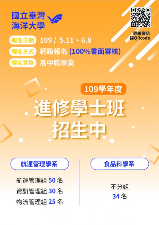 (一)航運管理學系進修學士班航運管理組:一般生 50 名,原住民 1 名。