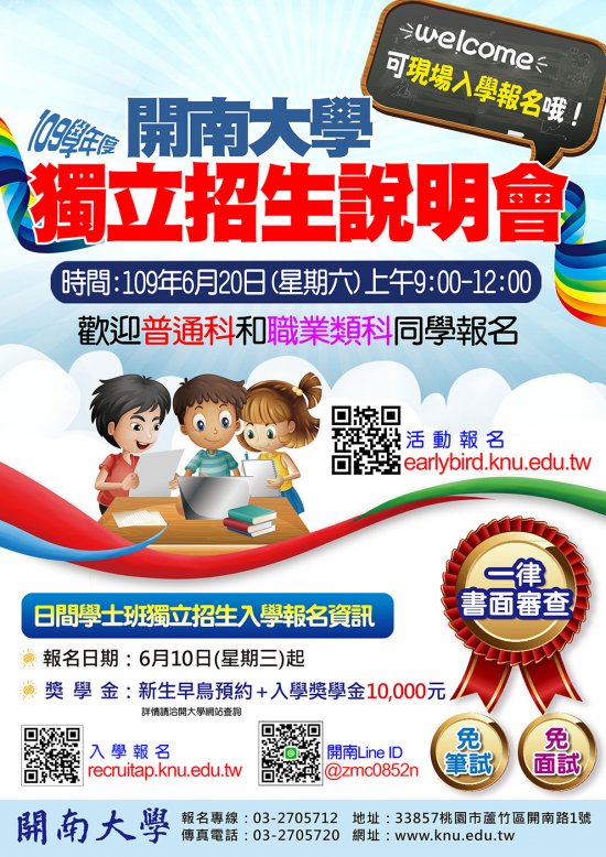 一、為落實多元入學理念,本校 109 學年度日間學士班單獨招生將於 109 年 06 月 10 日(星期三)開始報名。 二、增進考生與家長對於升學資訊之理解,於 109 年 06 月 20 日(星期六)舉辦「開南大學 109 學年度日間學士班單獨招生說明會」。 三、電子檔一式一份如附件,在校生及家長歡迎踴躍參加。