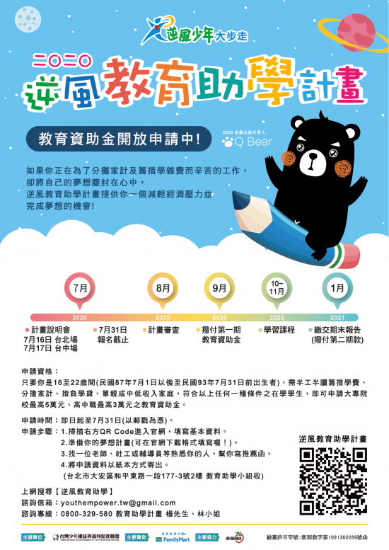 一、本活動旨在協助 16 至 22 歲需經濟自立、半工半讀之在學青少年,透過申請計劃,獲得教育資助金實踐夢想並完成學業。