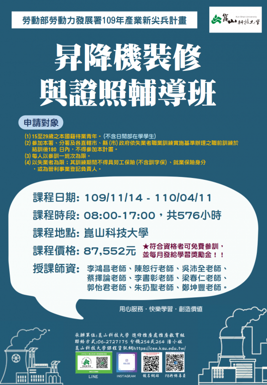 (七)「昇降機裝修與證照輔導班」https://cee.ksu.edu.tw/CourseInfo.aspx?id=2054