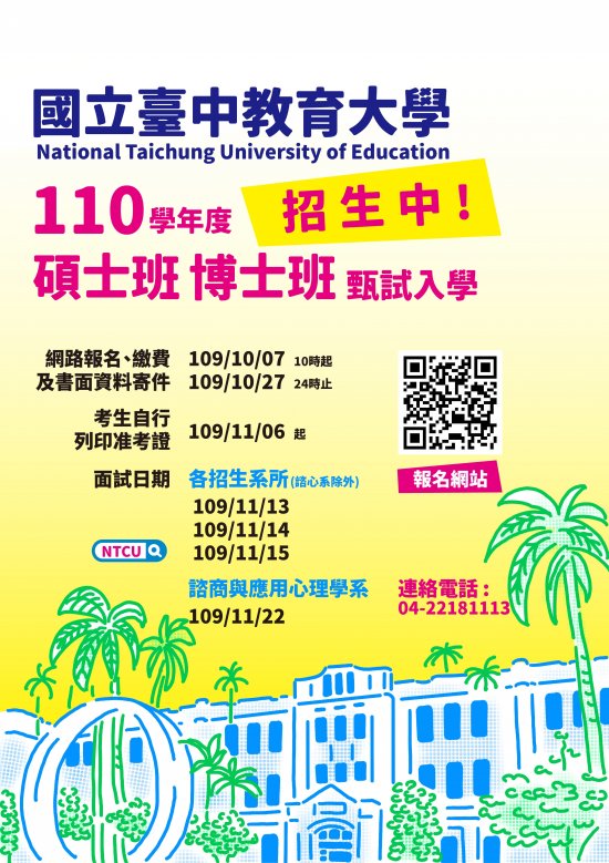 一、本招生考試一律採網路報名,報名日期自 109 年 10 月 7 日(星期三)10 時起至 109 年 10 月 27 日(星期二)24 時止。 二、招生簡章自 109 年 9 月 17 日起於本校網頁/招生資訊公告,不另發售紙本簡章,考生可自行由網頁查詢或列印(本校招生資訊網頁 https://oaaas.ntcu.edu.tw/)。 三、招生系所、招生名額、報考資格、報名事項及其他相關事項等,請詳招生簡章。