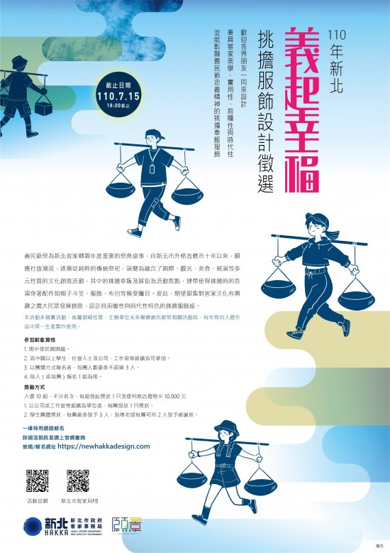 說明: 一、依據新北市政府 110 年 4 月 15 日新北府客綜字第 1100708917 號函辦理。 二、參加資格:本國籍高中職以上學生、社會人士及公司、工作室等組織皆可參加。 三、相關訊息刊登於活動官網( https://newhakkadesign.com/)。