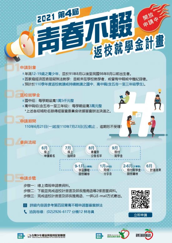 一、本計畫旨為協助年滿 12-19 歲之青少年,因家庭經濟因素,目前未在學校就學者或曾有中輟或中離紀錄者,提供返校期間所需之生活費及學雜費用,鼓勵學生早日返校完成學業。 二、本計畫於民國 110 年 06 月 21 日至民國 110 年 07 月 23 日開放申請,並於 7 月 13 日辦理線上說明會。詳細申請辦法及參與線上說明會請見活動網站: https://www.youthrights.org.tw/news/1803 。