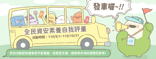 三、為培養學生建立健康、合理與合法的資訊科技使用態度與習慣,以增進網路學習正向效益,並提升教師資安素養與電腦防護能力,教育部自本(110)年 9 月 1 日至 10 月 31 日止舉辦「全民資安素養自我評量」活動,敬請協助將 banner 電子檔(如附件)置於貴校網站,並連結本活動網站(網址: https:/isafeevent.moe.edu.tw/),請師生於活動期間內踴躍上網觀看動畫教材及檢測資訊安全素養認知程度,並有機會參與抽獎。
