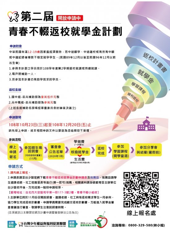社團法人台灣少年權益與福利促進聯盟辦理「第二屆青春不輟返校就學金計劃」招生